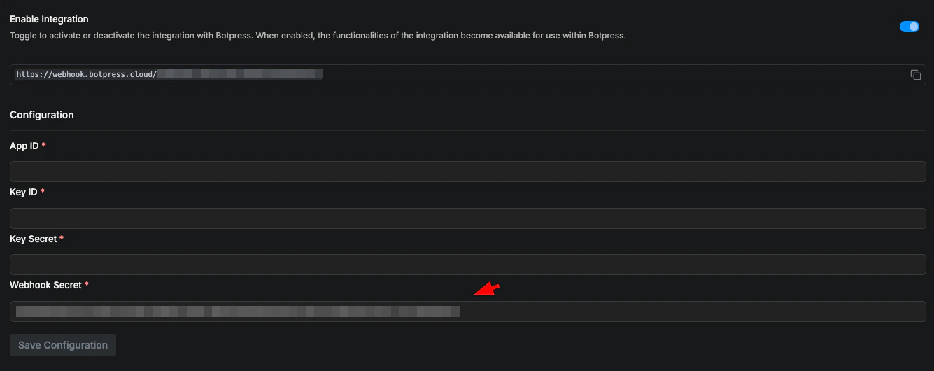 3. Copy the Shared Secret and past on the Botpress Integration Configuration page at Webhook Secret