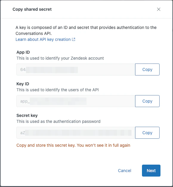 • Key ID: The Key ID of your Zendesk Conversation API Credentials